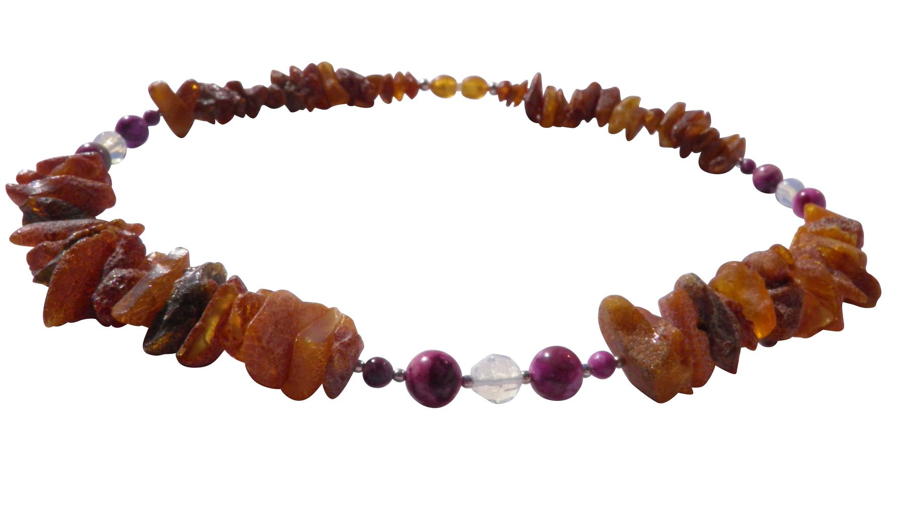 Material: Echter baltischer Bernstein, Sugilith, Mondstein, silberfarbene Schmuckperlen, Schmuckdraht, Kunststoff-Drehverschluss